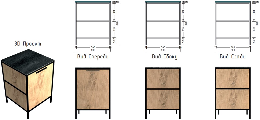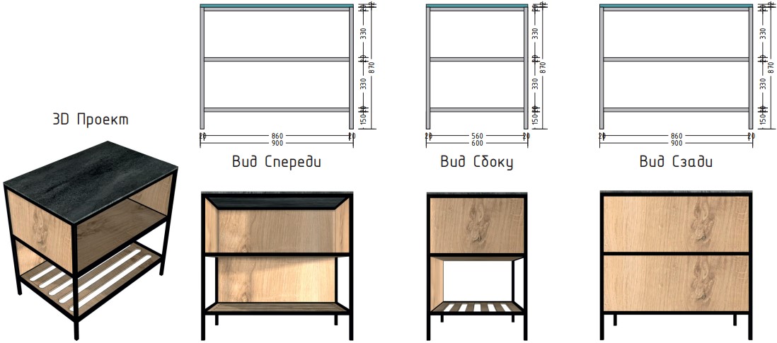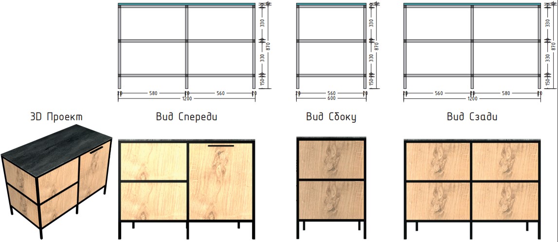 Материал столешницы Шунгит повторяет текстуру камня, древесный Ирландский дуб используется для каркаса и фасадов. В дальнейшем палитра цветов и ассортимент модулей будут расширяться.